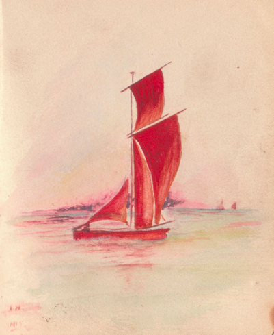 Yet another meticulous contribution is a fine miniature painting of a yacht that has some of the features of a Thames sailing barge, with its distinctive top sail, although it is a much smaller version, for one mariner only.