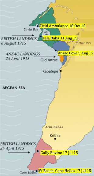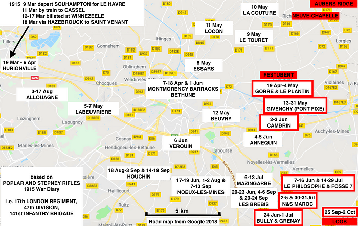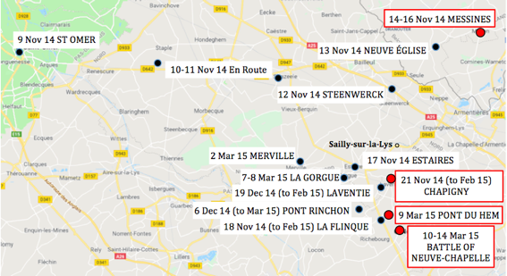 The 2nd Scottish Rifles’ itinerary in the early months of WW1 following their disembarkation at Le Havre in November 1914, up until the Battle of Neuve-Chapelle in March 1915 (front line engagement in red).