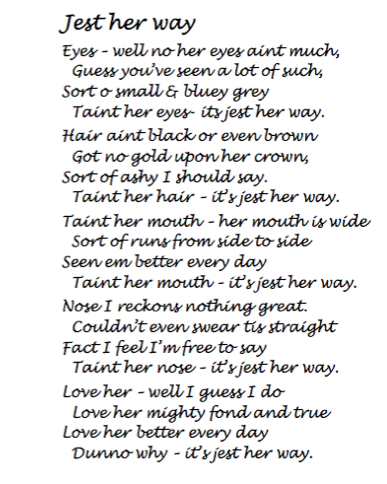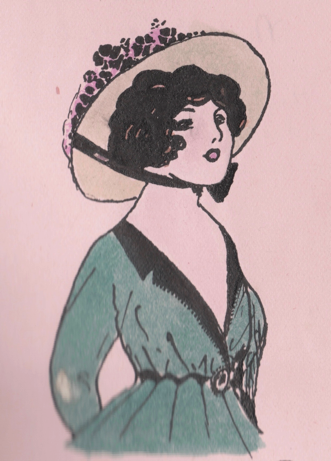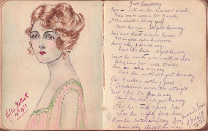 Elsewhere in Lizzie’s book, Nellie Hollick painted her own scintillating likeness alongside the verses that she penned, which bring to mind early ragtime lyrics — the wording is reminiscent of the street talk in I ain’t got nobody, which was composed in the same year, 1915, and in slightly later jazz standards such as T’aint nobody’s business if I do, from 1922.