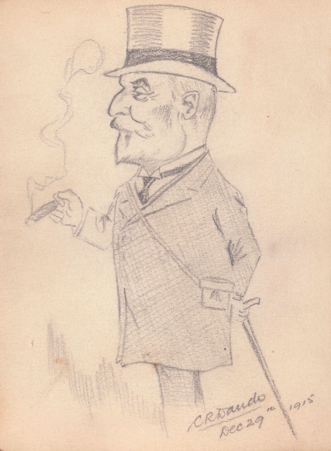 Further on in the book, Cecil Dando added a carefully crafted caricature of an Edwardian gentleman. It would be an agreeable bonus if this were a self portrait of CR Dando himself, but it looks very much as though it could be a sketch of George V at the races.