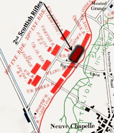 Assembly position of the 2nd Scottish Rifles at Signpost Lane, Neuve-Chapelle, on 10th March 1915 (British divisions in red, 11th Jäger Battalion trenches in green). Based on a map in the British Official History of Military Operations, 1915.
