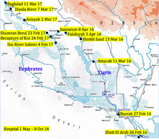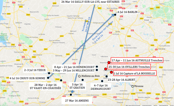 The 2nd Scottish Rifles’ itinerary March-July 1916 (front line engagement in red)