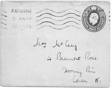 My Own Darling Lizzie — Your most welcome letter received this morning. I was very pleased to hear that Elsie & Winnie had been to see you, as it seems that they must have felt concerned. What a pity W. did not hear your knocks. I bet she would have been very pleased to have had you for company. G & E have got some pluck – fancy going off to Wembley for the day! — Am glad Sid thinks the work is being executed properly. I have got fed up writing about this affair so won’t say anymore about it. — It looks as though there was a decent fire in Cottenham Rd. yesterday. There is a picture in the D. Express (p.2) this morning showing furniture & household effects in the street. — I suppose you have already seen or heard about Hugo Hirst being made a Baronet. — Mayors are evidently in for another good holiday. I remember they had 2 splendid weeks last year. — Well Darling, this is all for now. I shall be thinking tomorrow of ‘six years ago’ & trying to recall some of the pleasant happenings of that day. Hoping you are managing to keep cool. — Heaps of love. — Your Ever Loving Husband, Ted
