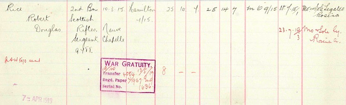 An amount of £25-14-7 was made payable to Bobbie’s sole legatee, his mother Rosina Rice. Later, when an additional War Gratuity was awarded to all those who had seen service, this too — £8 for a sergeant — was recorded in Bobbie’s account, and the final payment was made in July 1919.