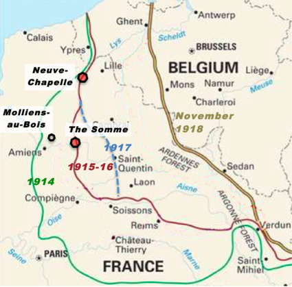 Molliens-au-Bois, on the left in the map above — based on a description of the Western Front in Encyclopædia Britannica, showing the extent of the initial occupation in 1914 [green], the frontline in 1915-16 [red], the Hindenburg Line in 1917 [blue], and the eventual position on Armistice Day, 11th November 1918 [brown]