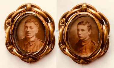 Lizzie’s double-sided sweetheart brooch, her memento mori, with photographs of her first fiancé Bobbie Rice (Left) and her husband Edward Joseph McLeay (Right) on either side of the spinning locket (now in the Imperial War Museum).