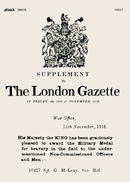 From the Official Gazette (London), No. 29819, 10/11 November 1916 (www.thegazette.co.uk)