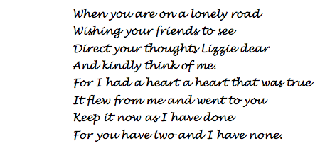 The second, initialled DH, hints at Lizzie’s solitude. What is more, if we were to take it literally, it also seems to convey the interest of a new admirer, although it seems more likely to be a popular rhyme that was in common use at the time.