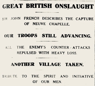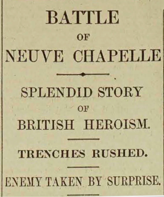 A week later, on 19th March, a detailed eye-witness account appeared in the Daily Telegraph, under the headline “Battle of Neuve Chapelle: Splendid Story of British Heroism”, hinting again at British military supremacy in the trenches.