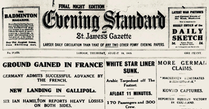 The Evening Standard, Friday 12th March 1915. Lizzie’s father worked on this newspaper as a printer (source: British Library microfilm)