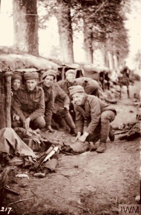 9th May 1915, 5.15am. Men of the 2nd Scottish Rifles preparing their battle kit outside a dugout before the Battle of Aubers Ridge (IWM Q51623)
