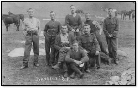 The picture postcard shows Bobbie Rice (seated middle row right, in uniform) with his platoon on Salisbury Plain in October 1914