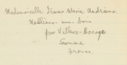Irma Andrieux, writing in French — a post card from Molliens-au-Bois, La Somme, April 1916 Mademoiselle — Nous avons en ce moment le sergent chez nous. Il est en bonne santé et nous sommes heureuses mère et moi de recevoir chez nous ceux qui luttent pour la grande victoire. Je vous envoie ma photo en face de la porte. Je vous embrasse. Votre amie Française, Irma Andrieux We have the sergeant with us right now. He is in good health, and mother and I are happy to welcome those who are fighting for the great victory into our home. I am sending you my picture in front of the gateway. With love and kisses. Your French friend, Irma Andrieux