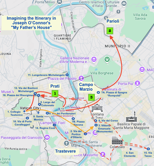 To me, the unresolved puzzle in My Father’s House is how the events surrounding drop no. [3] fit together on the map of Rome. But should they? The book is after all a creative tour de force. As the author explains in the concluding Caveat: “While real people and real events inspired the work of fiction that is My Father’s House, it is first and last a novel. Liberties have been taken with facts, characterisations and chronologies.” Nonetheless, while most published reviews of this book have searched out the true characters and events, this synopsis has been something of a quest for the true locations.